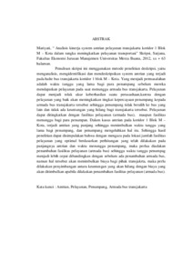 Penulisan skripsi ini menggunakan metode penelitian deskripsi, yaitu menganalisis, mengidentifikasi dan mendeskripsikan system antrian yang terjadi pada halte bus transjakarta koridor 1 blok M – Kota. Yang menjadi permasalahan adalah waktu tunggu yang lama bagi para penumpang sebelum mereka mendapatkan pelayanan pada saat menunggu armada bus transjakarta. Pelayanan dapat menjadi tolak ukur keberhasilan suatu perusashaan,karena dengan pelayanan yang baik akan meningkatkan tingkat kepercayaan penumpang kepada armada bus transjakarta tersebut sehingga penumpang tidak beralih ke bus yang lain dan tidak ada keuntungan yang hilang bagi transjakarta tersebut. Pelayanan dapat ditingkatkan dengan fasilitas pelayanan (armada bus), maupun fasilitas menunggu bagi para penumpan. Dalam kasus antrian pada koridor 1 Blok M – Kota, terjadi antrian yang panjang sehingga menimbulkan waktu tunggu yang lama bagi penumpang, dan penumpang mengeluhkan hal itu. Sehingga hasil penelitian dapat disimpulakan bahwa dengan mengacu pada lokasi jumlah fasilitas pelayanan yang optimal berdasarkan perhitungan yang telah dilakukan pada panjangnya antrian dan waktu menunggu penumpang, maka perlua diadakan penambahan fasilitas pelayanan (armada bus) sehingga waktu tunggu penumpag menjadi lebih cepat dibandingkan dengan sebelum ada penambahan armada bus, namun hal tersebut akan menimbulkan biaya bagi pihak transjakrta, maka perlu dilakukan penyimbangan antara keuntungan yang akan hilang dengan biaya yang akan ditimbulkan apabila dilakukan penambahan fasilitas pelayanan (armada bus).