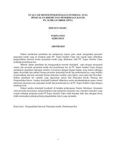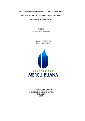 PURWANTO, PURWANTO (2012) EVALUASI SISTEM PENGENDALIAN INTERNAL ATAS PENJUALAN KREDIT DAN PENERIMAAN KAS DI PT. SUPRA SUMBER CIPTA. S1 thesis, Universitas Mercu Buana Jakarta.