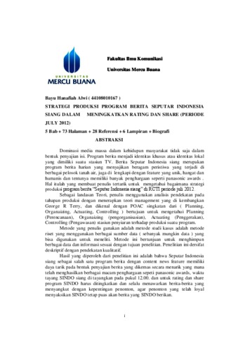 ALWI, BAYU HANAFIAH (2012) STRATEGI PRODUKSI PROGRAM BERITA SEPUTAR INDONESIA SIANG DALAM MENINGKATKAN RATING DAN SHARE DI RCTI (Periode Juli 2012). S1 thesis, Universitas Mercu Buana Jakarta.