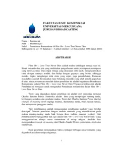 Film 18+ : Love True Never Dies adalah realita kehidupan remaja saat ini. Kisah romantis dua pria yang melakukan pengorbanan untuk perempuan-perempuan yang mereka cintai. Dan empat remaja yang disatukan oleh nasib, mengekspresikan cinta dengan caranya sendiri, dan hidup dengan gayanya yang bebas, sehingga mereka begitu menghargai nilai cinta yang sejati, juga persahabatan, Rumusan masalahnya adalah Berdasarkan latar belakang masalah yang telah penulis paparkan di atas, maka perumusan masalah dalam penelitian ini adalah bagaimana Pemaknaan Romantisme dalam Film 18+ : Love true Never Dies?.Tujuan penelitian ini adalah Penelitian ini bertujuan untuk mengetahui Pemaknaan romantisme dalam film 18+ : Love True Never Dies Teori yang digunakan dalam penelitian ini adalah teori semiotika menurut Charles Sanders Peirce. Semiotika adalah ilmu yang mempelajari tentang tanda, berfungsinya makna dan produksi makna. Teori dari Charles Sanders Peirce disebut triangle of meaning (teori segitiga makna), diantaranya tanda, objek (acuan tanda), dan interpretant (pengguna tanda). Tipe penelitiannya adalah menggunakan pendekatan kualiatif yang bersifat deskriptif. Metode penelitian dengan analisis semiotik yang memfokuskan pada makna masing-masing tanda baik berupa ikon, indeks, maupun symbol. Unit penelitian ini berupa gambar dan sign dalam film “18+ : love True Never Dies” yang menggambarkan adanya unsur romantisme di setiap adegan. Analisis data menggunakan triangle of meaning dari Charles Sander Peirce, yaitu tanda, objek dan interpretant. Hasil penelitian menunjukkan bahwa terdapat berbagai unsur romantis yang digambarkan dalam setiap adegannya.
