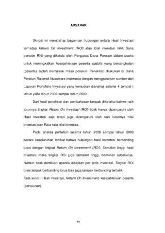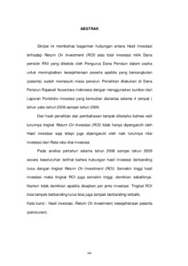 Skripsi ini membahas bagaiman hubungan antara Hasil Investasi terhadap Return On Investment (ROI) atas total investasi milik Dana pensión RNI yang dikelola oleh Pengurus Dana Pensiun dalam usaha untuk meningkatkan kesejahteraan peserta apabila yang bersangkutan (peserta) sudah memasuki masa pensiun. Penelitian dilakukan di Dana Pensiun Rajawali Nusantara Indonesia dengan menggunakan sumber dari Laporan Portofolio Investasi yang kemudian dianalisa selama 4 (empat ) tahun yaitu tahun 2006 sampai tahun 2009. Dari hasil penelitian dan pembahasan tampak diketahui bahwa naik turunnya tingkat Return On Investasi (ROI) tidak hanya dipengaruhi oleh Hasil investasi saja tetapi juga dipengaruhi oleh naik turunnya nilai investasi dan Rata-rata nilai investasi. Pada analisa pertahun selama tahun 2006 sampai tahun 2009 secara keseluruhan terlihat bahwa hubungan hasil investasi berbanding lurus dengan tingkat Return On Investment (ROI). Semakin tinggi hasil investasi maka tingkat ROI juga semakin tinggi, demikian sebaliknya. Namun tidak demikian apabila disajikan per jenis investasi. Tingkat ROI bisa tampak berbanding lurus bisa juga tampak berbanding terbalik. Kata kunci : Hasil investasi, Return On Investment, kesejahteraan peserta (pensiunan).