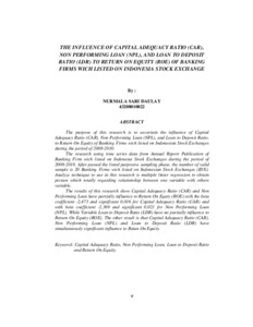 DAULAY, NURMALA SARI (2012) PENGARUH CAPITAL ADEQUACY RATIO (CAR), NON PERFORMING LOAN (NPL), DAN LOAN TO DEPOSIT RATIO (LDR) TERHADAP RETURN ON EQUITY (ROE) PADA PERUSAHAAN PERBANKAN YANG TERDAFTAR DI BURSA EFEK INDONESIA (BEI). S1 thesis, Universitas Mercu Buana Jakarta.