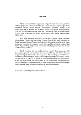 Skripsi ini membahas bagaimana pengaruh pendidikan dan pelatihan (diklat) prajabatan terhadap produktivitas Calon Pegawai Negeri Sipil. Data diperoleh melalui survey dengan menyebarkan kuesioner dengan skala pengukuran Likert kepada 38 responden pada Kementerian Pendayagunaan Aparatur Negara dan Reformasi Birokrasi. Dan analisis yang digunakan adalah regresi linear sederhana dan diolah menggunakan uji t dengan menggunakan SPSS 16.0. Dari hasil penelitian ini penulis mengetahui pengaruh Diklat Prajabatan (X) terhadap Produktivitas (Y) Calon Pegawai Negeri Sipil pada Kementerian Pendayagunaan Aparatur Negara dan Reformasi Birokrasi dengan hipotesis diklat prajabatan mempunyai pengaruh positif dan signifikan terhadap produktivitas Calon Pegawai Negeri Sipil pada Kementerian Pendayagunaan Aparatur Negara dan Reformasi Birokrasi. Hasil penelitian ini menunjukan bahwa variabel diklat prajabatan (X) berpengaruh positif dan signifikan terhadap produktivitas (Y) Calon Pegawai Negeri Sipil pada Kementerian Pendayagunaan Aparatur Negara dan Reformasi Birokrasi. Berdasarkan hasil analisis data dan pengujian hipotesis dengan hasil R Square sebesar 0,329 atau 32,9% diklat prajabatan mempengaruhi produktivitas Calon Pegawai Negeri Sipil dan sisanya 67,1% produktivitas dipengaruhi oleh faktor-faktor lain. Penulis menyarankan untuk penelitian selanjutnya melakukan penelitian pada diklat lainnya dengan lingkup penelitian diperluas.