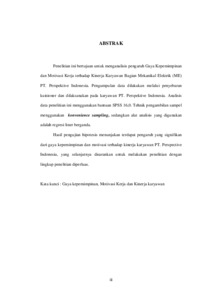 Penelitian ini bertujuan untuk menganalisis pengaruh Gaya Kepemimpinan dan Motivasi Kerja terhadap Kinerja Karyawan Bagian Mekanikal Elektrik (ME) PT. Perspektive Indonesia. Pengumpulan data dilakukan melalui penyebaran kuisioner dan dilaksanakan pada karyawan PT. Perspektive Indonesia. Analisis data penelitian ini menggunakan bantuan SPSS 16,0. Tehnik pengambilan sampel menggunakan konvenience sampling, sedangkan alat analisis yang digunakan adalah regresi liner berganda. Hasil pengujian hipotesis menunjukan terdapat pengaruh yang signifikan dari gaya kepemimpinan dan motivasi terhadap kinerja karyawan PT. Perspective Indonesia, yang selanjutnya disarankan untuk melakukan penelitian dengan lingkup penelitian diperluas.