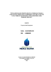 PURWANTI, NANI (2012) PENGARUH RASIO PROFITABILITAS TERHADAP HARGA SAHAM PADA PERUSAHAAN PROPERTY DAN REAL ESTATE YANG TERDAFTAR DI BURSA EFEK INDONESIA (BEI) PERIODE 2009-2011. S1 thesis, Universitas Mercu Buana Jakarta.