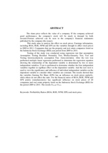 Harga saham mencerminkan nilai dari suatu perusahaan . Jika perusahaan mencapai prestasi yang baik, maka saham perusahaan tersebut akan banyak diminati oleh para investor.Prestasi baik yang dicapai perusahaan dapat dilihat didalam laporan keuangan yang dipublikasikan oleh perusahaan (emiten). Penelitian ini bertujuan untuk menganalisis terjadinya pengaruh pada harga saham. Informasi laba perusahaan yang meliputi ROA,ROE, NPM dan EPS adalah variabel yang diduga mempengaruhi harga saham tahun 2009 - 2011. Perusahaan yang digunakan adalah perusahaan property dan real estate yang terdaftar di Bursa Efek Indonesia (BEI) periode tahun 2009 - 2011. Pengujian terhadap penelitian ini dilakukan dengan menggunakan uji asumsi Pengujian Asumsi Regresi yaitu Uji Normalitas Residu, Uji Multikolinieritas, Uji Asumsi Bebas Heteroskedastisitas dan Pengujian Autokorelasi. Setelah itu dilakukan uji regresi linier berganda yang dilakukan untuk menentukan persamaan regresi yang menunjukkan hubungan variabel terikat yang ditentukan dengan dua atau lebih variabel bebas. Uji F yang dilakukan untuk mengetahui apakah keempat variabel bebas secara bersama-sama berpengaruh secara sigifikan terhadap variabel terikat. Dan yang terakhir uji-t digunakan untuk melihat signifikasi dan pengaruh variabel bebas secara individu terhadap variabel terikat dengan menganggap variabel lain bersifat konstan. Hasil penelitian menunjukkan bahwa variabel Earning Per Share (EPS) memiliki pengaruh terhadap harga saham secara parsial, sedangkan rasio yang lainnya tidak berpengaruh. Untuk rasio keuangan yang terdiri dari ROA, ROE, NPM dan EPS secara bersama-sama (simultan) memiliki pengaruh yang signifikan terhadap harga saham pada 20 perusahaan property dan real estate yang terdaftar di Bursa Efek Indonesia (BEI) selama periode 2009 - 2011.