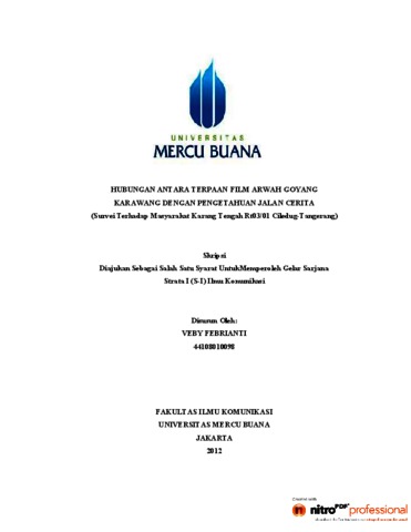 FEBRIANTI, VEBY (2012) HUBUNGAN ANTARA TERPAAN FILM ARWAH GOYANG KARAWANG DENGAN PENGETAHUAN JALAN CERITA (Survei Terhadap Masyarakat Karang Tengah Rt03/01 Ciledug-Tangerang). S1 thesis, Universitas Mercu Buana Jakarta.