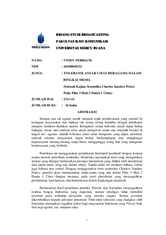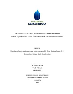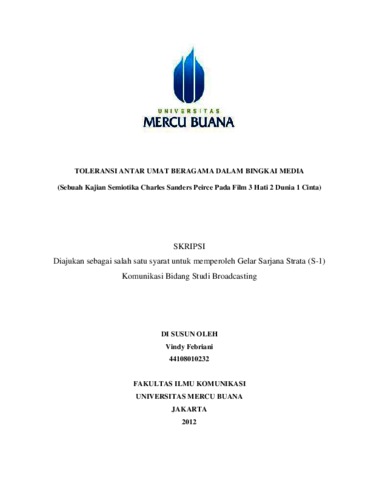 FEBRIANI, VINDY (2012) TOLERANSI ANTAR UMAT BERAGAMA DALAM BINGKAI MEDIA (Sebuah Kajian Semiotika Charles Sanders Peirce Pada Film 3 Hati 2 Dunia 1 Cinta). S1 thesis, Universitas Mercu Buana Jakarta.