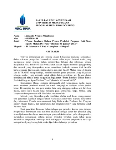 WICAKSONO, ARNANDO AVIANTO (2012) PERAN PRODUSER DALAM PROSES PRODUKSI PROGRAM SOFT NEWS SPORT 7 MALAM DI TRANS 7 (Periode 31 Januari 2012). S1 thesis, Universitas Mercu Buana Jakarta.
