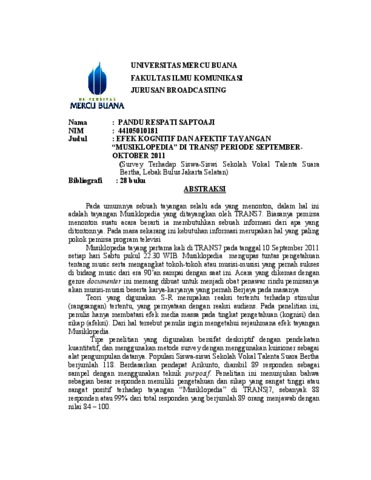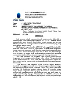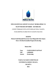 SAPTOAJI, PANDU RESPATI (2012) EFEK KOGNITIF DAN AFEKTIF TAYANGAN “MUSIKLOPEDIA” DI TRANS7 PERIODE SEPTEMBER - OKTOBER 2011 (SURVEY TERHADAP SISWA-SISWI SEKOLAH VOCAL TALENTA SUARA BERTHA DI LEBAK BULUS JAKARTA SELATAN). S1 thesis, Universitas Mercu Buana Jakarta.