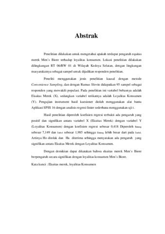 Penelitian dilakukan untuk mengetahui apakah terdapat pengaruh equitas merek Men’s Biore terhadap loyalitas konsumen. Lokasi penelitian dilakukan dilingkungan RT 06/RW 01 di Wilayah Kedoya Selatan, dengan lingkungan masyarakatnya sebagai sampel untuk dijadikan responden penelitian. Peneliti menggunakan jenis penelitian kausal dengan metode Convenience Sampling, dan dengan Rumus Slovin didapatkan 95 sampel sebagai responden yang mewakili populasi. Pada penelitian ini variabel bebasnya adalah Ekuitas Merek (X), sedangkan variabel terikatnya adalah Loyalitas Konsumen (Y). Pengujian instrument hasil kuesioner diolah menggunakan alat bantu Aplikasi SPSS 16 dengan analisis regresi linier sederhana menggunakan uji t. Hasil penelitian diperoleh koefisien regresi terbukti ada pengaruh yang positif dan signifikan antara variabel X (Ekuitas Merek) dengan variabel Y (Loyalitas Konsumen) dengan koefisien regresi sebesar 0,418 Diperoleh thitung sebesar 7,149 dan ttabel sebesar 1,985 sehingga thitung lebih besar dari pada ttabel. Artinya Ho ditolak dan Ha diterima sehingga menyatakan ada pengaruh yang signifikan antara Ekuitas Merek dengan Loyalitas Konsumen. Dengan demikian dapat dikatakan bahwa ekuitas merek Men’s Biore berpengaruh secara signifikan dengan loyalitas konsumen Men’s Biore