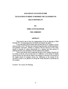 This research was to know the implamentation of the tax planning in Malta Printindo, PT. In minimizing income tax burden of corporate tax payers. In this data study used secondary data and data used is the company’s income statement data in 2010. The data were analyzed using descriptive method quantitative and qualitative descriptive. Method is consistent with the objectives of the study, namely to describe or outline characteristic of a situation and find answers to problems that have been identified in the formulation of the problem. These result indicate that tax palnning was done by the company minimize the tax burden is still the most, because there is a difference in the amount of taxable income between the firm and the authors, this resulted in a decrease in the amount of the unpaid amount of corporate income tax. Differences in the amount of tax increment revenue is not paid,the tax saving that would otherwise be performed by the company. Keyword : Tax, Income Tax Planning
