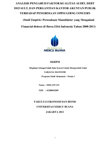 MEGAWATI, MEGAWATI (2012) ANALISIS PENGARUH FAKTOR KUALITAS AUDIT, DEBT DEFAULT, DAN PERGANTIAN KANTOR AKUNTAN PUBLIK TERHADAP PENERIMAAN OPINI GOING CONCERN (Studi Empiris: Perusahaan Manufaktur yang Mengalami Financial distress di Bursa Efek Indonesia Tahun 2008-2011). S1 thesis, Universitas Mercu Buana Jakarta.