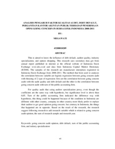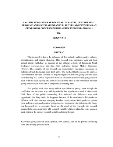 This is aimed to know the influence of debt default, auditor quality, industry specialization, and opinon shopping. This research uses secondary data got from annual report published in internet at the official website of Indonesia Stock Exchange www.idx.co.id and data from Indonesia Capital Market Dictionary (ICDM). The samples of the research are manufacture enterprises registered in Indonesia Stock Exchange from 2008-2011. The method that been used to analyses the correlation between variable are logistic regression between going concern audit with theusing of 2 type of regression: first are the correlation between going concern audit with the audit quality and debt default and the other is the correlation between going concern audit with turn of the public accounting firm. For quality audit that using auditor specialization proxy, even though the coefficient are the same way with hypothesis, but significance level is above than 0,05. Turn of the public accounting firm indicated the difference way with hypothesis, this thing could be happened because of the condition in Indonesia are different with other country, company in other country more likely prefer to replace their auditor to get good opinion going concern. but contrary in Indonesia, the things that happened are in opposite. Based on the result of the research, the research suggest following research to add research variable which is related to going concern audit opinion, the sum of research sample and research year.