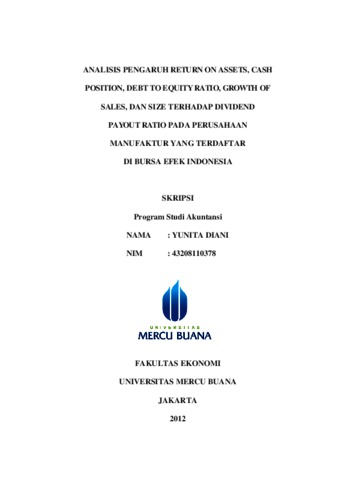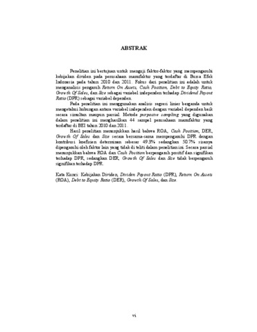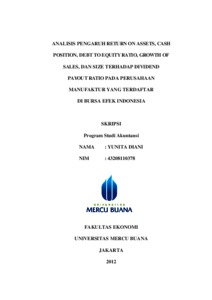 DIANI, YUNITA (2012) ANALISIS PENGARUH RETURN ON ASSETS, CASH POSITION, DEBT TO EQUITY RATIO, GROWTH OF SALES, DAN SIZE TERHADAP DIVIDEND PAYOUT RATIO PADA PERUSAHAAN MANUFAKTUR YANG TERDAFTAR DI BURSA EFEK INDONESIA. S1 thesis, Universitas Mercu Buana Jakarta.