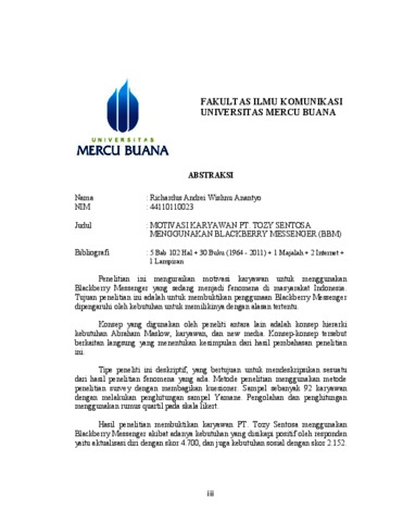 Penelitian ini menguraikan motivasi karyawan untuk menggunakan Blackberry Messenger yang sedang menjadi fenomena di masyarakat Indonesia. Tujuan penelitian ini adalah untuk membuktikan penggunaan Blackberry Messenger dipengaruhi oleh kebutuhan untuk memilikinya dengan alasan tertentu. Konsep yang digunakan oleh peneliti antara lain adalah konsep hierarki kebutuhan Abraham Maslow, karyawan, dan new media. Konsep-konsep tersebut berkaitan langsung yang menentukan kesimpulan dari hasil pembahasan penelitian ini. Tipe peneliti ini deskriptif, yang bertujuan untuk mendeskripsikan sesuatu dari hasil penelitian fenomena yang ada. Metode penelitian menggunakan metode penelitian survey dengan membagikan kuesioner. Sampel sebanyak 92 karyawan dengan melakukan penghitungan sampel Yamane. Pengolahan dan penghitungan menggunakan rumus quartil pada skala likert. Hasil penelitian membuktikan karyawan PT. Tozy Sentosa menggunakan Blackberry Messenger akibat adanya kebutuhan yang disikapi positif oleh responden yaitu aktualisasi diri dengan skor 4.700, dan juga kebutuhan sosial dengan skor 2.152.