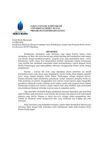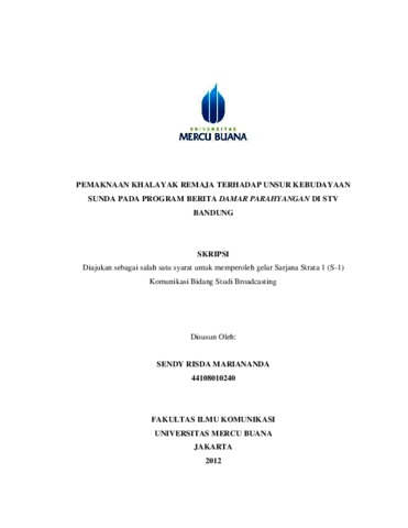 MARIANANDA, SENDY RISDA (2012) PEMAKNAAN KHALAYAK REMAJA TERHADAP UNSUR KEBUDAYAAN SUNDA PADA PROGRAM BERITA DAMAR PARAHYANGAN DI SCTV BANDUNG. S1 thesis, Universitas Mercu Buana Jakarta.