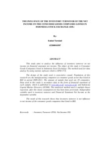 Penelitian ini bertujuan untuk menganalisis pengaruh perputaran persediaan terhadap laba bersih sebuah laporan keuangan. Objek penelitian ini adalah perusahaan barang konsumsi yang terdaftar di Bursa Efek Indonesia. Metode analisis data yang digunakan dalam penelitian ini adalah metode analisis statistik dengan menggunakan software statistik, yaitu SPSS 17.0. Desain penelitian yang digunakan adalah asosiatif kausal. Populasi dalam penelitian ini adalah perusahaan – perusahaan manufaktur Industri barang konsumsi yang terdapat di Bursa Efek Indonesia (BEI), dengan periode yang diteliti 2009-2011. Sampel yang digunakan dalam penelitian ini berjumlah 29 perusahaan. Data yang digunakan adalah data sekunder berupa laporan keuangan masing-masing sampel yang dipublikasikan di www.idx.co.id, www.jsx.co.id dan Indonesia Capital Market Directory (ICDM). Metode analisis yang digunakan adalah metode analisis regresi tunggal, setelah pengujian asumsi klasik dilakukan sebelumnya. Variabel Independent yang digunakan adalah perputaran persediaan dengan Laba bersih sebagai variabel dependen. Hasil analisi menunjukkan bahwa perputaran persediaan tidak berpengaruh signifikan terhadap laba bersih pada perusahaan barang konsumsi yang tercatat di Bursa Efek Indonesia.