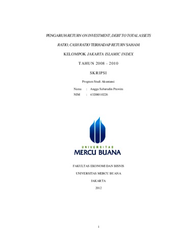 PRAWIRA, ANGGA SABARUDIN (2012) PENGARUH RETURN ON INVESTMENT, DEBT TO TOTAL ASSETS RATIO, CASH RATIO TERHADAP RETURN SAHAM KELOMPOK JAKARTA ISLAMIC INDEX 2008-2010. S1 thesis, Universitas Mercu Buana Jakarta.