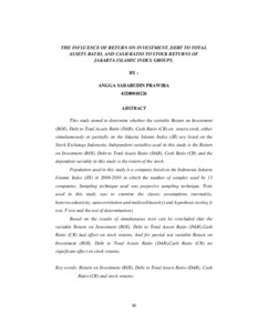 enelitian ini bertujuan untuk menentukan apakah variabel Return on Investment (ROI), Debt Total Assets Ratio (DAR), Cash Ratio (CR), dan return saham, baik secara simultan maupun parsial pada kelompok Jakarta Islamic Index (JII) yang terdaftar di Bursa Efek Indonesia. Variabel bebas yang digunakan dalam penelitian ini adalah Return on Investment (ROI), Debt Total Assets Ratio (DAR), Cash Ratio (CR) dan variabel terikat dalam penelitian ini adalah kembalinya saham. Populasi yang digunakan dalam penelitian ini adalah perusahaan yang terdaftar di Bursa Efek Indonesia kelompok Jakarta Islamic Index (JII) pada 2008-2010 di mana jumlah sampel yang digunakan sebanyak 13 perusahaan. Teknik sampling yang digunakan adalah teknik purposive sampling. Tes yang digunakan dalam penelitian ini adalah untuk menguji asumsi klasik (normalitas, heteroskedastisitas, autokorelasi dan multikolinearitas) dan pengujian hipotesis (uji t, uji F dan uji determinasi). Berdasarkan hasil uji simultan dapat disimpulkan bahwa variabel laba atas investasi (ROI), rasio hutang terhadap total aktiva (DAR), rasio kas (CR) tidak berpengaruh terhadap return saham. Parsial variabel cash ratio (CR), kembali atas aktiva (ROA) tidak berpengaruh signifikan terhadap return saham. Variabel rasio harga laba (PER) berpengaruh signifikan terhadap return saham.