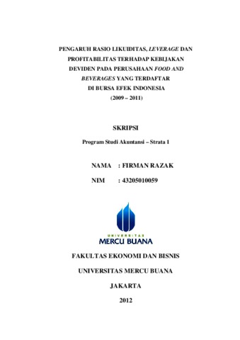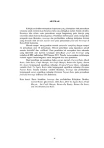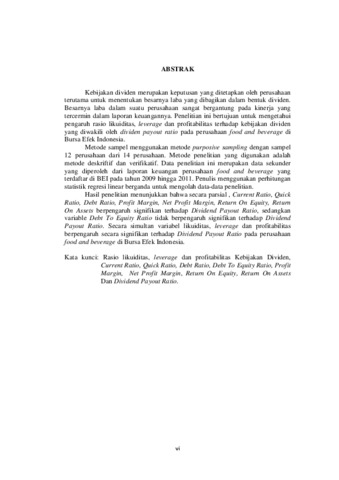 RAZAK, FIRMAN (2012) PENGARUH RASIO LIKUIDITAS, LEVERAGE DAN PROFITABILITAS TERHADAP KEBIJAKAN DEVIDEN PADA PERUSAHAAN FOOD AND BEVERAGES YANG TERDAFTAR DI BURSA EFEK INDONESIA (2009 – 2011). S1 thesis, Universitas Mercu Buana Jakarta.
