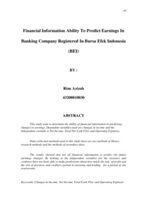 Penelitian ini bertujuan untuk mengetahui kemampuan informasi keuangan dalam memprediksi perubahan laba. Variabel dependen yang digunakan adalah perubahan laba dan variabel independennya adalah Laba Bersih, Total Arus Kas Bersih, dan Beban Operasi. Metode pengumpulan data yang digunakan dalam penelitian ini ada dua metode yaitu metode penelitian kepustakaan dan metode data sekunder. Hasil penelitian menunjukkan bahwa tidak semua informasi keuangan mampu memprediksi perubahan laba yang akan datang. Dengan melihat variabel independen tersebut para investor dan kreditor belum dapat melakukan prediksi mengenai seberapa besar tingkat laba dan resiko yang diperoleh investor dan kreditor dalam berinvestasi dan pemberian kredit untuk jangka waktu satu tahun yang akan datang.
