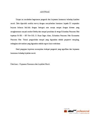 Skripsi ini membahas bagaimana pengaruh dari kepuasan konsumen terhadap loyalitas merek. Data diperoleh melalui survey dengan menyebarkan kuesioner kepada 85 responden berjenis kelamin laki-laki dengan katergori usia remaja sampai dengan dewasa yang mengkonsumsi minyak rambut Gatsby dari sampel penelitian di warga Kelurahan Pancoran Mas tepatnya Rt 001 – 007 Rw 018, Jl. Raya Cagar Alam, Kelurahan Pancoran Mas Kecamatan Pancoran Mas. Teknik pengembilan sampel yang digunakan adalah purposive sampling, sedangkan alat analisis yang digunakan adalah regresi linier sederhana. Hasil pengujian hipotesis menunjukan terdapat pengaruh yang signifikan dari kepuasan konsumen terhadap loyalitas merek