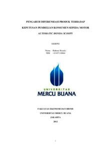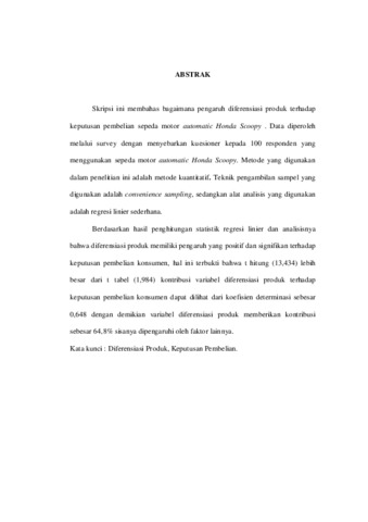 Skripsi ini membahas bagaimana pengaruh diferensiasi produk terhadap keputusan pembelian sepeda motor automatic Honda Scoopy . Data diperoleh melalui survey dengan menyebarkan kuesioner kepada 100 responden yang menggunakan sepeda motor automatic Honda Scoopy. Metode yang digunakan dalam penelitian ini adalah metode kuantitatif. Teknik pengambilan sampel yang digunakan adalah convenience sampling, sedangkan alat analisis yang digunakan adalah regresi linier sederhana. Berdasarkan hasil penghitungan statistik regresi linier dan analisisnya bahwa diferensiasi produk memiliki pengaruh yang positif dan signifikan terhadap keputusan pembelian konsumen, hal ini terbukti bahwa t hitung (13,434) lebih besar dari t tabel (1,984) kontribusi variabel diferensiasi produk terhadap keputusan pembelian konsumen dapat dilihat dari koefisien determinasi sebesar 0,648 dengan demikian variabel diferensiasi produk memberikan kontribusi sebesar 64,8% sisanya dipengaruhi oleh faktor lainnya