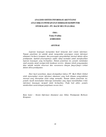 Laporan keuangan merupakan hasil keluaran dari sistem informasi. Tujuan penelitian ini adalah untuk mengetahui penerapan sistem informasi akuntansi berbasis komputer dan penerapan pengendalian internal dalam siklus pendapatan. Apakah penerapannya sudah cukup memadai untuk menghasilkan laporan keuangan yang berkualitas. Dalam penelitian ini, penulis melakukan studi pustaka untuk memperoleh landasan teoritis. Adapun teknik pengumpulan data adalah melalui observasi dan wawancara dengan fungsi-fungsi terkait dalam siklus pendapatan. Dari hasil penelitian, dapat disimpulkan bahwa PT. Bach Multi Global telah menerapkan sistem informasi akuntansi yang baik dimana pengendalian internal yang diterapkan telah cukup memadai. Namun dalam penelitian ini, penulis masih menemukan beberapa kelemahan yang dapat menimbulkan risiko informasi keuangan menjadi tidak berkualitas. Pada bab akhir, penulis memberikan saran dengan penjelasan secara rinci.