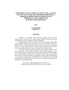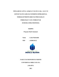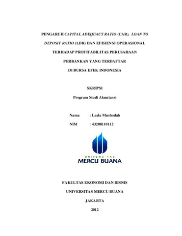 MUSHODAH, LAELA (2012) PENGARUH CAPITAL ADEQUACY RATIO (CAR), LOAN TO DEPOSIT RATIO (LDR) DAN EFISIENSI OPERASIONAL TERHADAP PROFITABILITAS PERUSAHAAN PERBANKAN YANG TERDAFTAR DI BURSA EFEK INDONESIA. S1 thesis, Universitas Mercu Buana Jakarta.