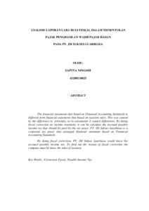Laporan Keuangan yang disusun berdasarkan Standar Akuntansi Keuangan (SAK) berbeda dengan laporan keuangan yang disusun berdasarkan ketentuan perpajakan. Hal ini disebabkan karena adanya perbedaan prinsip diantara keduanya, sehingga dalam perhitungannya menimbulkan perbedaan dan selisih, maka dapat dihitung besarnya PPh terutang yang harus dibayar oleh Wajib Pajak PT. JSI Sukses Luarbiasa merupakan Wajib Pajak Badan yang telah menyusun laporan keuangan berdasarkan Standar Akuntansi Keuangan. Dengan melakukan koreksi fiskal, maka PT. JSI Sukses Luarbiasa dapat mengetahui PPh Terutang yang harus dibayar. Untuk mengetahui alasan adanya koreksi fiskal maka perusahaan harus mengetahui peraturan perpajakan yang berlaku