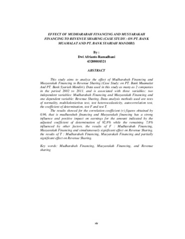 Penelitian ini bertujuan untuk menganalisaPengaruh Pembiayaan Mudharabah dan Pembiayaan Musyarakah Terhadap Besarnya Pendapatan Bagi Hasil (StudiKasus pada PT. Bank Muamalat dan PT. Bank Syariah Mandiri).Data yang digunakan dalam penelitian sebanyak 2 perusahaan dalam kurun waktu 2002 – 2011, dan dihubungkan 3 variabel yaitu : 2 variabel independen : Pembiayaan Mudharabah dan Pembiayaan Musyarakah dan 1 variabel dependen : Pendapatan Bagi Hasil. Metode analisis data yang digunakan adalah uji normalitas, uji multikolonieritas, uji heteroskedastisitas, uji autokorelasi, koefisien determinasi, uji F dan uji T. Hasil penelitian menunjukkan untuk koefisien korelasi (r) didapatkan angka sebesar 0,967, artinya pembiayaan mudharabah dan pembiayaan musyarakah memiliki pengaruh kuat dan positif terhadap pendapatan bagi hasil ditunjukkan dengan besarnya koefisien determinasi yang telah disesuaikan sebesar 92,8% sedangkan sisanya 7,8% dipengaruhi faktor lain. Untuk hasil uji F : Pembiayaan Mudharabah dan Pembiayaan Musyarakah secara simultan berpengaruhsignifikan terhadap pendapatan bagi hasil. Untuk hasil uji T Pembiayaan Mudharabah dan Pembiayaan Musyarakah secara parsial berpengaruh signifikan terhadap pendapatan bagi hasil.