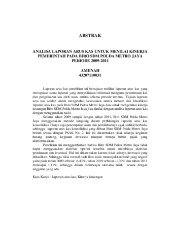 Laporan arus kas penelitian ini bertujuan melihat laporan arus kas yang rnerupakan suatu laporan yang menyediakan informasi mengenai penerimaan kas dan pengeluaran kas oleh suatu entitas selama periode tertentu. Tujuan laporan arus kas adalah untuk mengetahui kesesuaian antara metode dan klasifikasi laporan arus kas pada Biro SDM Polda Metro Jaya dan untuk mengetahui kinerja keuangan Biro SDM Polda Metro Jaya jika dinilai dengan analisa laporan arus kas dengan menggunakan rasio. Selama tahun 2009 sampai dengan tahun 2011, Biro SDM Polda Metro Jaya menggunakan metode langsung dalam perhitungan laporan arus kas konsolidasi. Hanya saja penempatan akun dan pemilahannya agak sedikit berbeda, sehingga laporan arus kas konsolidasi yang dibuat Biro SDM Polda Metro Jaya belum sesuai dengan PSAK No. 2, hal ini dikarenakan tidak adanya kegiatan hutang piutang, kegiatan investasi maupun berapa beban pajak yang diinformasikan. Penelitian ini menggambarkan bahwa Biro SDM Polda Metro Jaya tidak dapat menggunakan aktivitas operasi tersebut untuk membiaya aktivitas pendanaan dan investasi. Hal ini dikarenakan karena tidak adanya investasi yang dihasilkan. Sehingga nilai overall cash flow ratio menunjukkan hasil yang negatif yaitu pada tahun 2009 sebesar -6,43%, tahun 2010 sebesar -1,30% dan tahun 2011 mencapai 1,11%, sehingga dalam membiayai aktivitas tidak sesuai dengan anggaran yang ada. Kata Kunci : Laporan arus kas, Kinerja keuangan