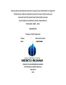 KUNTARTI, DETI (2012) PENGARUH DIVIDEND PAYOUT RATIO DAN RETURN ON EQUITY TERHADAP PRICE EARNING RATIO PADA PERUSAHAAN MANUFAKTUR SEKTOR INDUSTRI DASAR DAN KIMIA DI BURSA EFEK INDONESIA PERIODE 2009 - 2011. S1 thesis, Universitas Mercu Buana Jakarta.