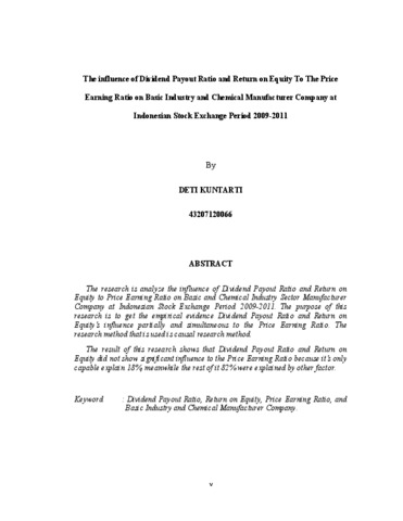 Penelitian ini menganalisis pengaruh Dividend Payout Ratio dan Return on Equity terhadap Price Earning Ratio pada perusahaan manufaktur sektor industri dasar dan kimia di Bursa Efek Indonesia selama periode 2009 - 2011. Tujuan dari penelitian ini adalah untuk mendapatkan bukti empiris pengaruh Dividend Payout Ratio dan Return on Equity baik secara parsial maupun serempak terhadap Price Earning Ratio. Metode penelitian yang digunakan adalah metode penelitian kausal. Hasil dari penelitian ini menunjukkan bahwa Dividend Payout Ratio dan Return on Equity tidak menunjukkan pengaruh yang signifikan terhadap Price Earning Ratio karena hanya mampu menjelaskan sebesar 18% saja, sedangkan sisanya 82% dijelaskan oleh faktor-faktor lain.
