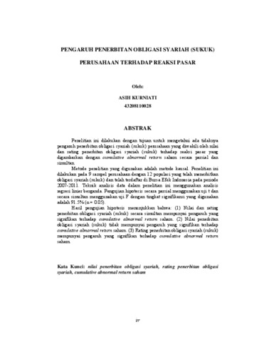 Penelitian ini dilakukan dengan tujuan untuk mengetahui ada tidaknya pengaruh penerbitan obligasi syariah (sukuk) perusahaan yang diwakili oleh nilai dan rating penerbitan obligasi syariah (sukuk) terhadap reaksi pasar yang digambarkan dengan cumulative abnormal return saham secara parsial dan simultan. Metode penelitian yang digunakan adalah metode kausal. Penelitian ini dilakukan pada 9 sampel perusahaan dengan 12 populasi yang telah menerbitkan obligasi syariah (sukuk) dan telah terdaftar di Bursa Efek Indonesia pada periode 2007-2011. Teknik analisis data dalam penelitian ini menggunakan analisis regresi linier berganda. Pengujian hipotesis secara parsial menggunakan uji t dan secara simultan menggunakan uji F dengan tingkat signifikansi yang digunakan adalah 91.5% (α = 0.05). Hasil pengujian hipotesis menunjukkan bahwa: (1) Nilai dan rating penerbitan obligasi syariah (sukuk) secara simultan mempunyai pengaruh yang signifikan terhadap cumulative abnormal return saham. (2) Nilai penerbitan obligasi syariah (sukuk) tidak mempunyai pengaruh yang signifikan terhadap cumulative abnormal return saham. (3) Rating penerbitan obligasi syariah (sukuk) mempunyai pengaruh yang signifikan terhadap cumulative abnormal return saham.