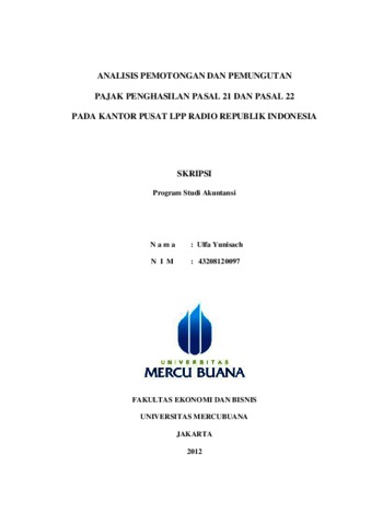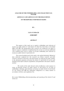 The purpose of this study was to analyze withholding and collection of income tax under Article 21 and Article 22 which has been done on the Head Office LPP RRI. The background of this research was conducted in an effort to improve taxpayer compliance in implementing the tax laws to avoid any additional costs resulting from errors or delays in account withholding and collection of income tax under Article 21 and Article 22 The research method used in this study is the method deskriptip. Method of data collection conducted for this research was library research and field research consisted of interviews and observations. In analyzing the data relating to the alternative payment of Income Tax Article 21 and Article 22 of the used methods of descriptive analysis of qualitative and quantitative descriptive analysis method. . The results of this study showed a lack of adherence to the taxpayer in terms of reporting income tax under Article 21 and Article 22. In terms of withholding, collection, and remittance of income tax under Article 21 and Article 22, the Central LPP RRI has undertaken obligations in a timely manner in accordance with laws and regulations Tax