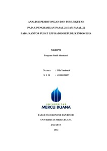 YUNISACH, ULFA (2012) ANALISIS PEMOTONGAN DAN PEMUNGUTAN PAJAK PENGHASILAN PASAL 21 DAN PASAL 22 PADA KANTOR PUSAT LPP RADIO REPUBLIK INDONESIA. S1 thesis, Universitas Mercu Buana Jakarta.