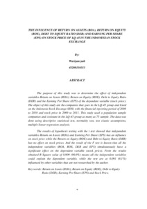 The purpose of this study was to determine the effect of independent variables Return on Assets (ROA), Return on Equity (ROE), Debt to Equity Ratio (DER) and the Earning Per Share (EPS) of the dependent variable (stock price). The object of this study are the companies that goes in the LQ-45 group and listed on the Indonesia Stock Excange (IDX) with the financial reporting period of 2008 to 2010 and stock price in 2009 to 2011. This study used a population sample companies and cosistant in the LQ-45 group as many as 75 sample. The data was done using descriptive statistical test, normality test, test classic assumptions, multiple linear regression analysis. The results of hypothesis testing with the t test showed that independent variables Return on Assets (ROA) and Earning Per Share (EPS) has an influence on stock price while the Return on Equity (ROE) and Debt to Equity Ratio (DER) has no effect on stock prices. And the result of the F test is known that all the independent variables (ROA, ROE, DER and EPS) simultaneously have a significant effect on the dependent variable (stock price). From the results obtained R Square value of 0,909 (90,9%) means all the independent variables could explain the dependent variable, while the rest are at 0,091 (9,1%) influenced by other variables that are not researched by the author.