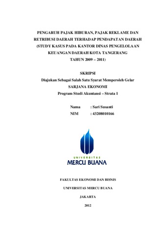 SUSANTI, SARI (2012) PENGARUH PAJAK HIBURAN, PAJAK REKLAME DAN RETRIBUSI DAERAH TERHADAP PENDAPATAN DAERAH (STUDI KASUS PADA KANTOR DINAS PENGELOLAAN KEUANGAN DAERAH KOTA TANGERANG TAHUN 2009-2011). S1 thesis, Universitas Mercu Buana Jakarta.
