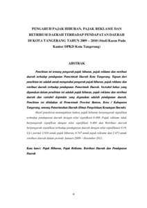 Penelitian ini tentang pengaruh pajak hiburan, pajak reklame dan retribusi daerah terhadap pendapatan Pemerintah Daerah Kota Tangerang. Tujuan dari penelitian ini adalah untuk mengetahui pengaruh pajak hiburan, pajak reklame dan retribusi daerah terhadap pendapatan Pemerintah Daerah. Variabel bebas yang digunakan dalam penelitian ini adalah pajak hiburan, pajak reklame dan retribusi daerah dan variabel dependen yang digunakan adalah pendapatan daerah. Penelitian ini dilakukan di Pemerintah Provinsi Banten, Kota / Kabupaten Tangerang, tentang Pemerintahan Daerah (Dinas Pengelolaan Keuangan Daerah). Hasil penelitian menunjukkan bahwa pajak hiburan berpengaruh signifikan terhadap pendapatan daerah dengan nilai signifikasi 0.008. Pajak reklame tidak berpengaruh signifikan dengan nilai signifikasi 0.460 dan Retribusi daerah berpengaruh signifikan terhadap pendapatan daerah dengan nilai signifikansi 0.19. Uji t parsial 2.816 untuk pajak hiburan, 0.747 untuk pajak reklame dan 2.473 untuk retribusi daerah dalam periode Januari 2009 – Desember 2011.