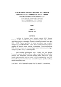 ANDRIANA, ANDRIANA (2012) PENGARUH ROE, FINANCIAL LEVERAGE, DAN FIRM SIZE TERHADAP SAHAM UNDERPRICING : STUDY EMPIRIK PADA PERUSAHAAN YANG MELAKUKAN INITIAL PUBLIC OFFERING (IPO) DI SINGAPORE EXCHANGE Ltd (SGX). S1 thesis, Universitas Mercu Buana Jakarta.
