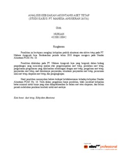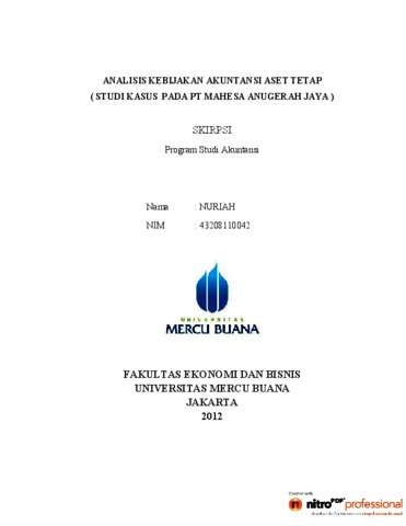 NURIAH, NURIAH (2012) ANALISIS KEBIJAKAN AKUNTANSI ASET TETAP ( STUDI KASUS PADA PT MAHESA ANUGERAH JAYA ). S1 thesis, Universitas Mercu Buana Jakarta.