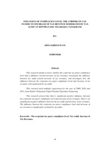 Penelitian ini bertujuan untuk mengetahui apakah tingkat kepatuhan wajib pajak badan memiliki pengaruh terhadap peningkatan penerimaan pajak penghasilan, mengetahui pengaruh antara pemeriksaan pajak terhadap peningkatan penerimaan pajak , dan mengetahui bagaimana pengaruh antara tingkat kepatuhan wajib pajak badan dan peningkatan penerimaan pajak dengan dimoderasi oleh pemeriksaan pajak. Penelitian ini menggunakan regresi berganda dari tahun 2009, 2010 dan 2011, pada Kantor Pelayanan Pajak Pratama Tigaraksa Tangerang. Penelitian ini menunjukkan bahwa ada pengaruh positif yang signifikan antara tingkat kepatuhan wajib pajak badan dan peningkatan penerimaan pajak. Ada pengaruh negatif antara pemeriksaan pajak dan peningkatan penerimaan pajak. Terdapat pengaruh antara tingkat kepatuhan wajib pajak badan terhadap peningkatan penerimaan pajak secara signifikan yang dimoderasi oleh pemeriksaan pajak.