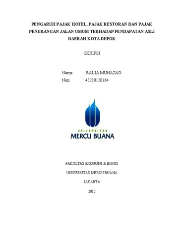 MUNAZAD, BALIA (2012) PENGARUH PAJAK HOTEL, PAJAK RESTORAN DAN PAJAK PENERANGAN JALAN UMUM TERHADAP PENDAPATAN ASLI DAERAH KOTA DEPOK. S1 thesis, Universitas Mercu Buana Jakarta.