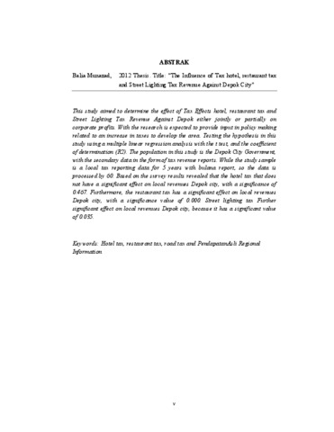 Penelitian ini bertujuan untuk mengetahui pengaruh Pengaruh Pajak Hotel, pajak Restoran dan Pajak Penerangan Jalan Terhadap Pendapatan Asli Daerah Kota Depok baik secara bersama-sama maupun secara parsial terhadap laba perusahaan. Dengan adanya penelitian ini diharapkan dapat memberikan masukan dalam membuat kebijakan yang berhubungan dengan peningkatan pajak daerah untuk mengembangkan daerah . Pengujian hipotesis dalam penelitian ini menggunakan alat analisis regresi linier berganda dengan uji t, dan koefisien determinasi (R2). Populasi dalam penelitian ini adalah Pemerintah Daerah Kota Depok, dengan data skunder berupa laporan penerimaan pajak. Sedangkan sampel penelitian adalah data laporan pajak daerah selama 5 tahun dengan laporan bulanan, sehingga data diolah sebanyak 60. Berdasarkan hasil penelitian diketahui bahwa pajak hotel mempunyai pengaruh yang tidak signifikan terhadap pendapatan asli daerah kota depok, dengan signifikansi 0,467. Selanjutnya pajak restoran mempunyai pengaruh yang signifikan terhadap pendapatan asli daerah kota Depok, dengan nilai signifikansi 0,000. Selanjutnya pajak penerangan Jalan berpengaruh signifikan terhadap pendapatan asli daerah kota Depok, karena memiliki nilai signifikansi 0,035.