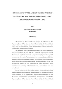 The purpose of this research is to analyze the influence of Non Performing Loans (NPL), Loan to Deposit Ratio (LDR), Net Interest Margin (NIM), and Firm Size (SIZE) to Capital Adequacy Ratio (CAR) of banking firm which listed on Indonesia Stock Exchange. The population used in this study are all banks that listing on Indonesia Stock Exchange during the years 2009-2011. And for the purpose of this research, this research’s samples is chosen with a purposive sampling method and find 28 companies that the criteria. Types of data used are secondary data from Info Bank Magazine. Analysis technique used is double regression and hypothesis test use t- statistic to test coefficient of regression partial and also f-statistic to test the truth of collectively influence in level significance 5%. Other also done a classic assumption test covering multicolliniearity test, autocorrelation test and normality test. During reseach period show as data research was normality distributed. Based on multicolliniearity test and autocorrelation test variable digressing of classic assumption has not founded, which indicated that available data has fulfil the condition to use multilinier regression model. The regression’s result that Non Performing Loans (NPL), Loan to Deposit Ratio (LDR), Net Interest Margin vii (NIM), and Firm Size (SIZE) have a simultaneously effect toward Capital Adequacy Ratio (CAR) in banking sector at the Indonesia Stock Exchange. Non Performing Loans (NPL), Loan to Deposit Ratio (LDR), and Firm Size (SIZE) in partial significant toward Capital Adequacy Ratio (CAR) at level significant less 5% (each equal to 0,009, 0,012 and 0,004). Net Interest Margin (NIM) not significant to effect Capital Adequacy Ratio (CAR) at level of significant more than 5% (each equal 0,091). This research only limited with 28 sample and annual perception period during 3 years, with prediction ability to 24,7%.