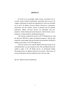 In the face of an increasingly complex business environment such as currently requirred method of performance measurement that can assess the company’s performance accurately and comprehensively. In this case the method can be used is the Balance Scorecard. Balance Scorecard is a performance measurement tool that combines measures of financial and non financial performance. Balance Scorecard measures the performance from four perspective, namely learning and growth perspective, internal business process perspective, customer perspective, and financial perspective. The researcher conducted the research on PT. US Freight Services using the data from 2008-2010 to analyze the financial perspective, while for other perspectives using company data and calculation of questionnaires distributed to employees and customer of PT. US Freight Services. From the research results using the Balanced Scorecard concept can be concluded that there was some variation in results. Thus, the Balanced Scorecard suitable to apply to PT. US Freight Services, an International Freight Forwarding because the Balanced Scorecard can provide a better picture of structured and intensive than the traditional system is still in use today