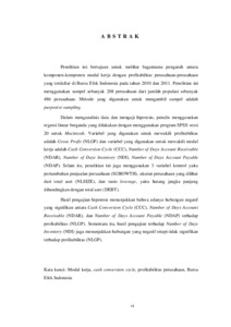 Penelitian ini bertujuan untuk melihat bagaimana pengaruh antara komponen-komponen modal kerja dengan profitabilitas perusahaan-perusahaan yang terdaftar di Bursa Efek Indonesia pada tahun 2010 dan 2011. Penelitian ini menggunakan sampel sebanyak 208 perusahaan dari jumlah populasi sebanyak 486 perusahaan. Metode yang digunakan untuk mengambil sampel adalah purposive sampling. Dalam menganalisis data dan menguji hipotesis, penulis menggunakan regresi linear berganda yang dilakukan dengan menggunakan program SPSS versi 20 untuk Macintosh. Variabel yang digunakan untuk mewakili profitabilitas adalah Gross Profit (NLGP) dan variabel yang digunakan untuk mewakili modal kerja adalah Cash Conversion Cycle (CCC), Number of Days Account Receivable (NDAR), Number of Days Inventory (NDI), Number of Days Account Payable (NDAP). Selain itu, penelitian ini juga menggunakan 3 variabel kontrol yaitu pertumbuhan penjualan perusahaan (SGROWTH), ukuran perusahaan yang dilihat dari total aset (NLSIZE), dan rasio leverage, yaitu hutang jangka panjang dibandingkan dengan total aset (DEBT). Hasil pengujian hipotesis menunjukkan bahwa adanya hubungan negatif yang signifikan antara Cash Conversion Cycle (CCC), Number of Days Account Receivable (NDAR), dan Number of Days Account Payable (NDAP) terhadap profitabilitas (NLGP). Sementara itu, hasil pengujian terhadap Number of Days Inventory (NDI) juga menunjukkan hubungan yang negatif tetapi tidak signifikan terhadap profitabilitas (NLGP).