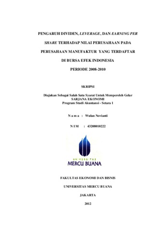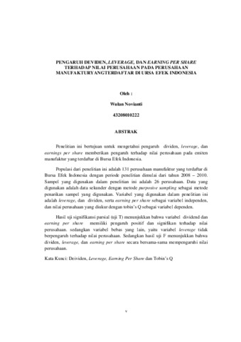 NOVIANTI, WULAN (2012) PENGARUH DIVIDEN, LEVERAGE, DAN EARNING PER SHARE TERHADAP NILAI PERUSAHAAN PADA PERUSAHAAN MANUFAKTUR YANG TERDAFTAR DI BURSA EFEK INDONESIA PERIODE 2008-2010. S1 thesis, Universitas Mercu Buana Jakarta.